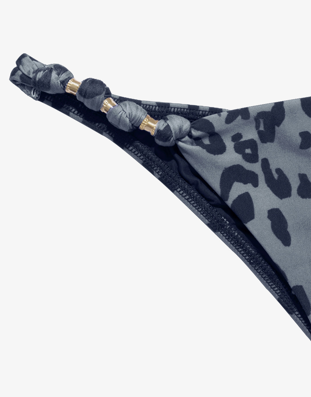 The Maila Paula bikini pant from ViX is a pretty grey animal print pant with knotted side straps intertwined with 24k gold coated beads.