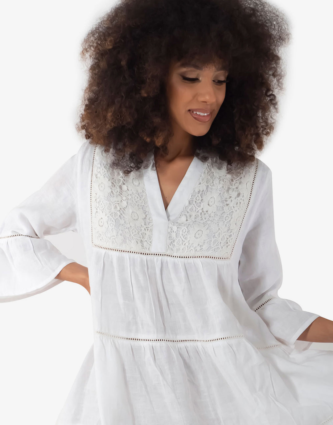 For a sophisticated vacation style choose the Iconique white Dalia dress from Iconique. Woven from a luxurious linen and cotton blend, this breezy dress features a flowy design with a multi-tiered skirt and a lace insert at the top.