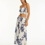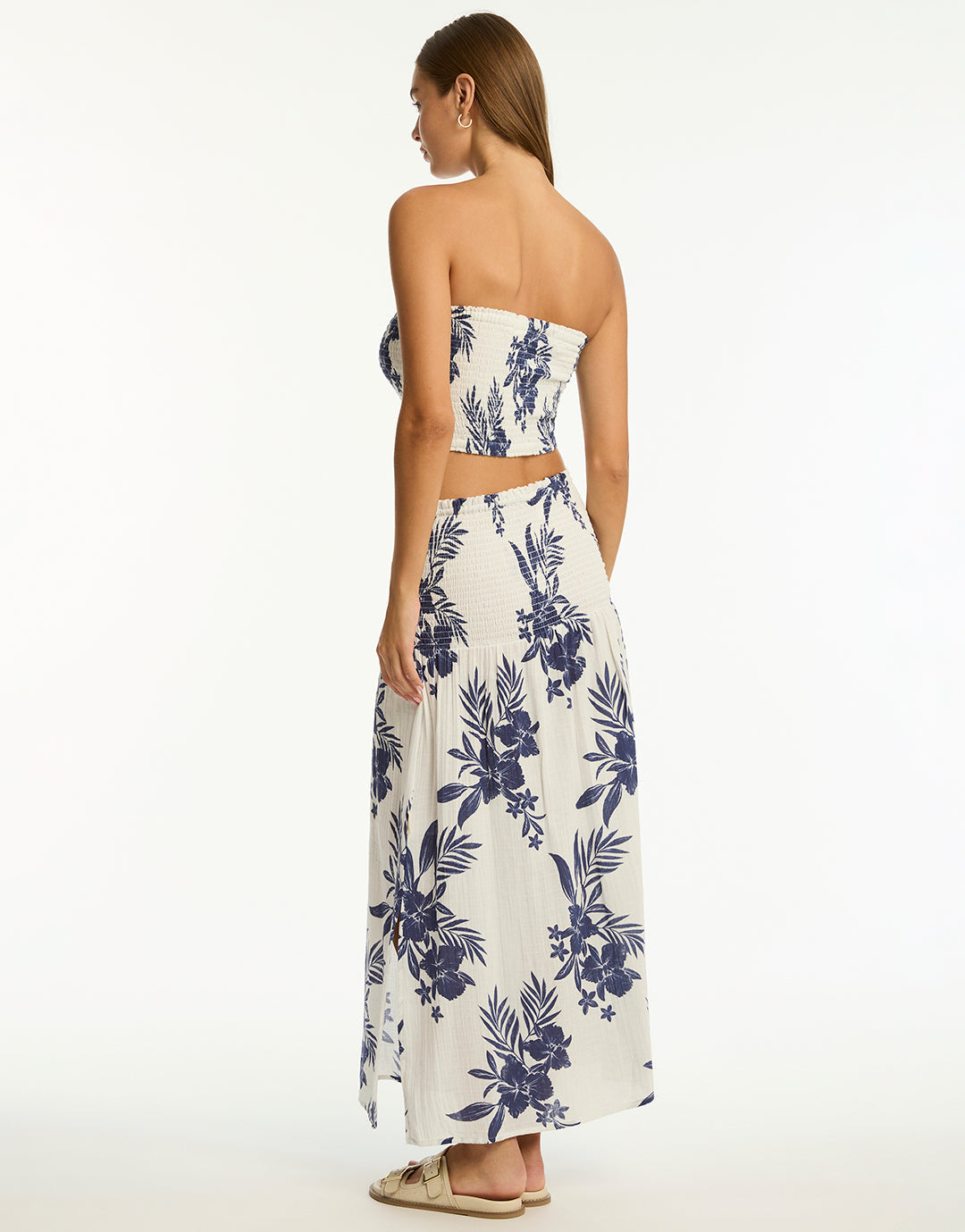 The Aloha Beach skirt from Sea Level is a maxi-length skirt with an elasticated shirred, flattering drop waist, short side slits and drawstring tie and brilliantly it can be worn as a skirt or pulled up over the bust as a lovely strapless bandeau dress.