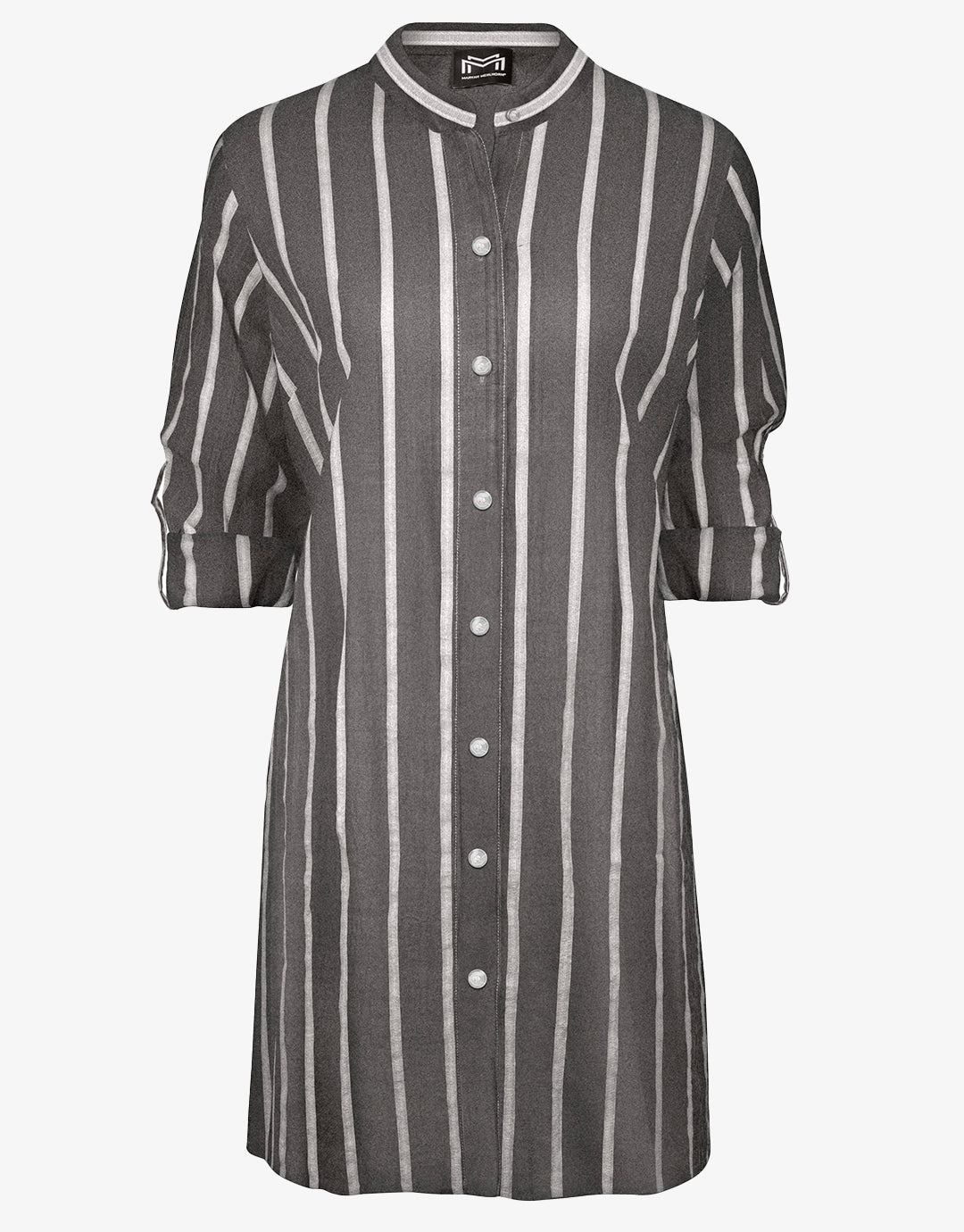 The Argentum Beach Shirt from Maryan Mehlhorn is a stylish zinc grey and white striped, smart beach shirt with a button front, roll up sleeves and a mandarin collar.