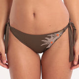 Parade along the beach in style wearing Banana Moon's Cabana Boa Tie Bikini Bottom. This khaki pant has beautiful palm embellishment on the side which is sure to make you stand out from the crowd. Tie sides make this adjustable for the perfect fit.