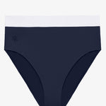 The Bel Air High Waist bikini pant from Lauren is a flattering navy blue style with a wide contrasting white band at the waist.