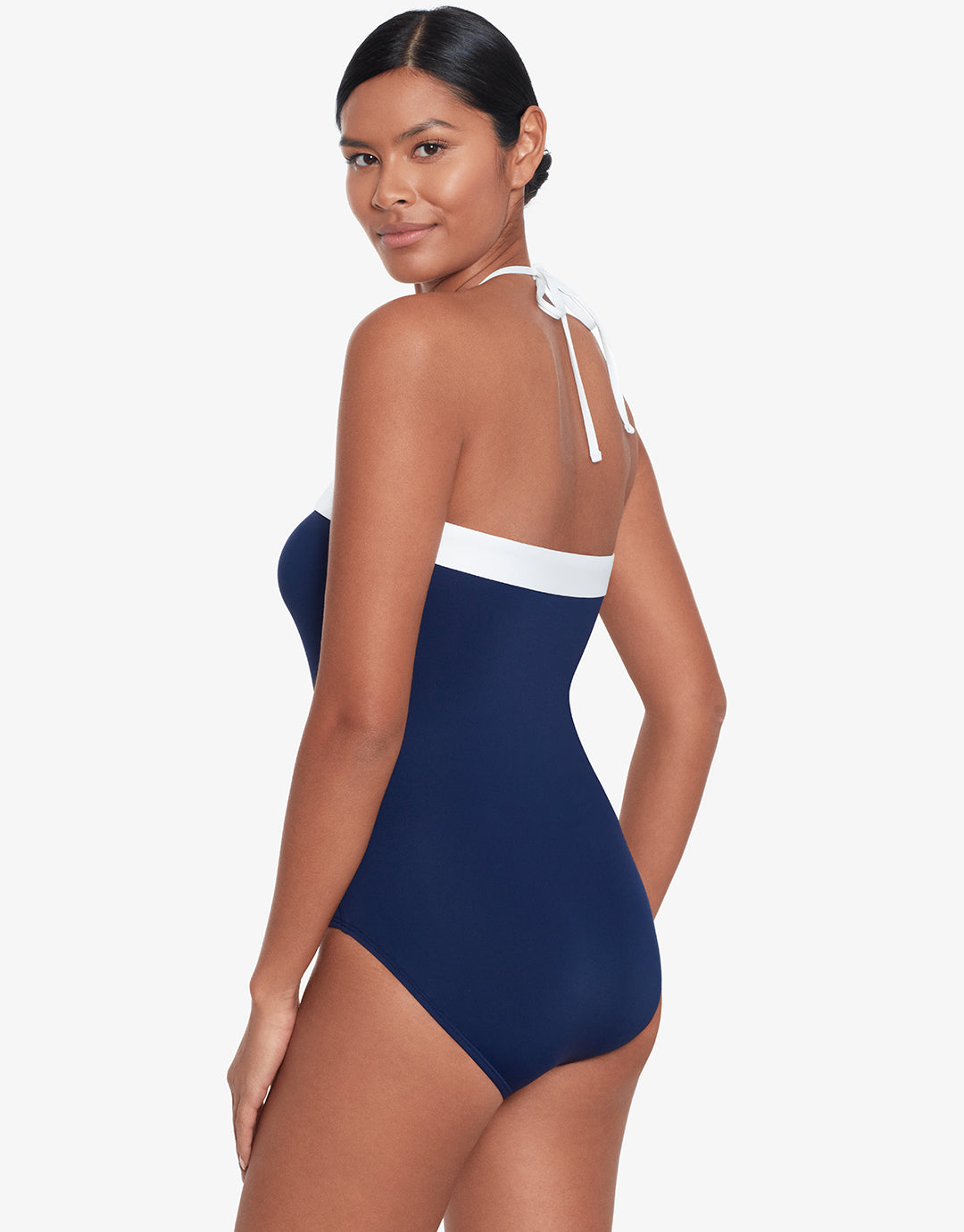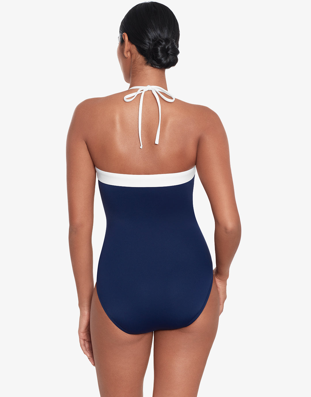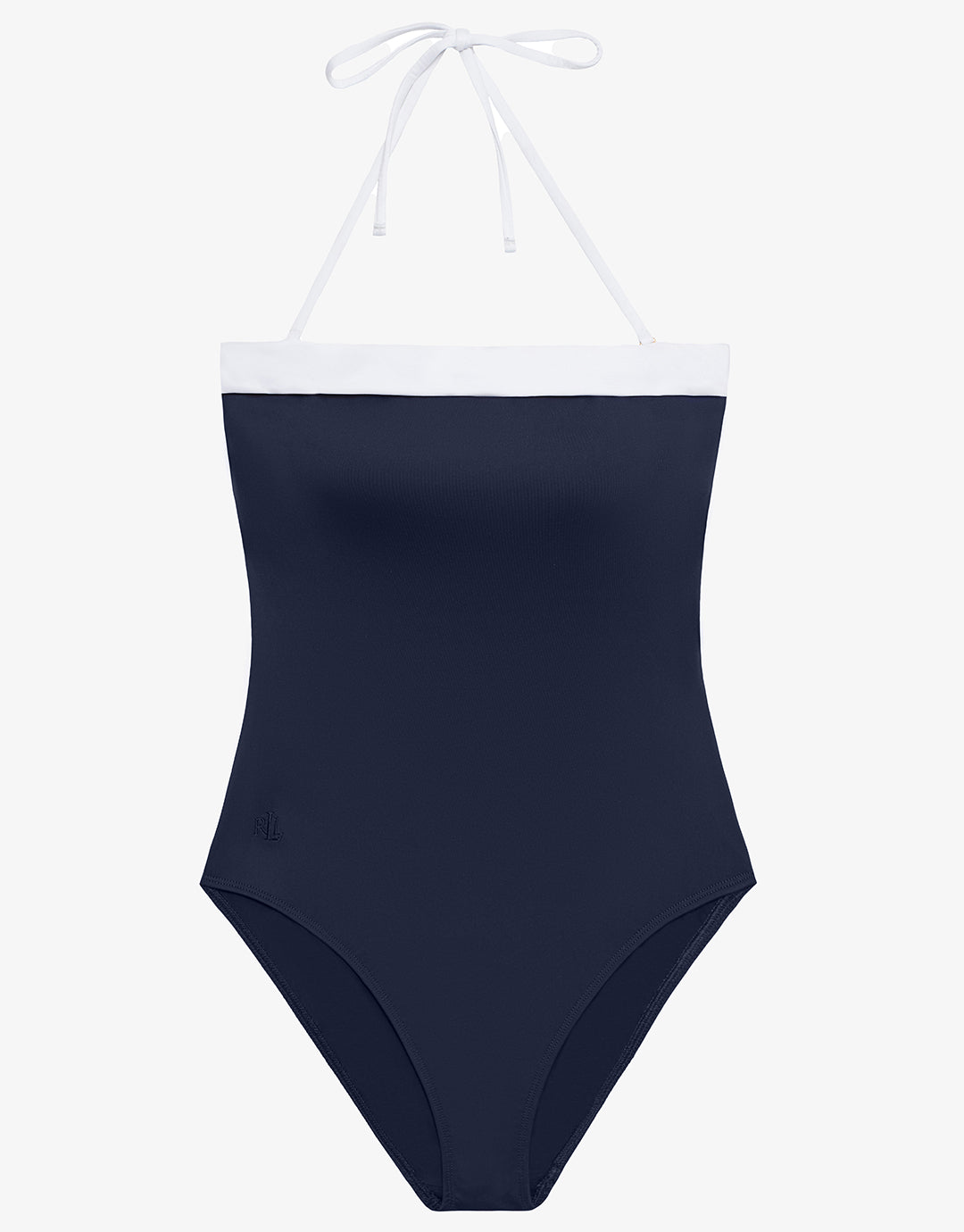The Bel Air Modern Bandeau swimsuit from Lauren is an elegant navy blue style with a wide contrasting white band at the neckline. With removable cups, optional neck ties and a shaping fit, this is a classic look swimsuit.
