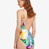 The Bora Bora Round Neck swimsuit from Gottex is a bright and beautiful tropical floral print style with a round neck, narrow adjustable straps, soft padded cups and a low back.