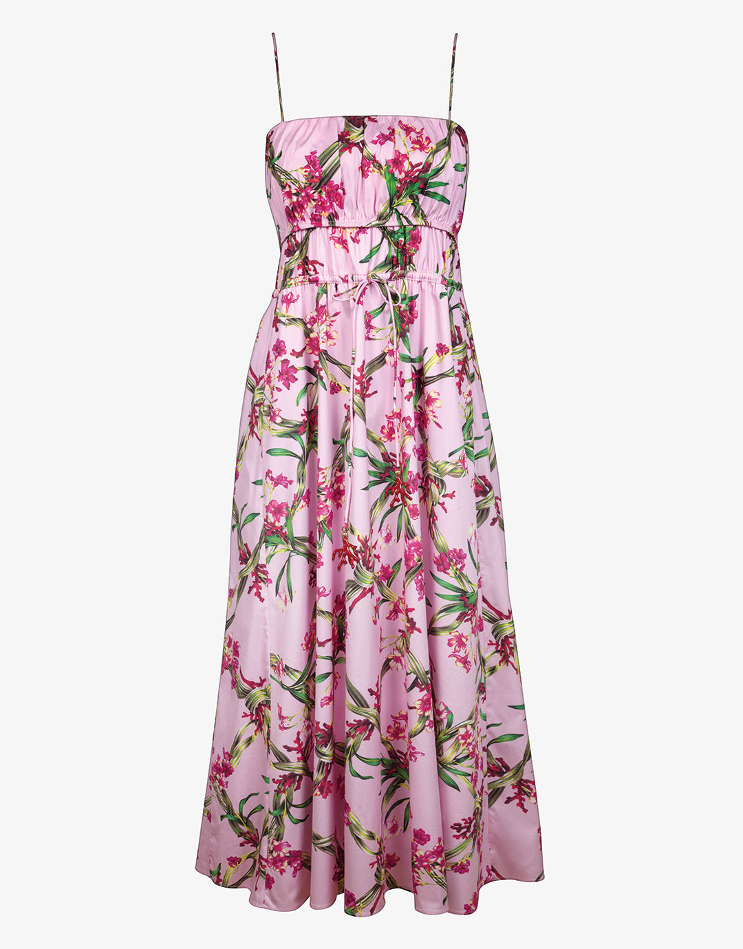 The Botanique dress from Maryan Mehlhorn in a floral pink and green print is a beautifully feminine midi length dress cut in an empire line style, with thin straps and pleating over the bust with a wide band underneath. A full skirt falls from a draw tie that cinches around the waist.