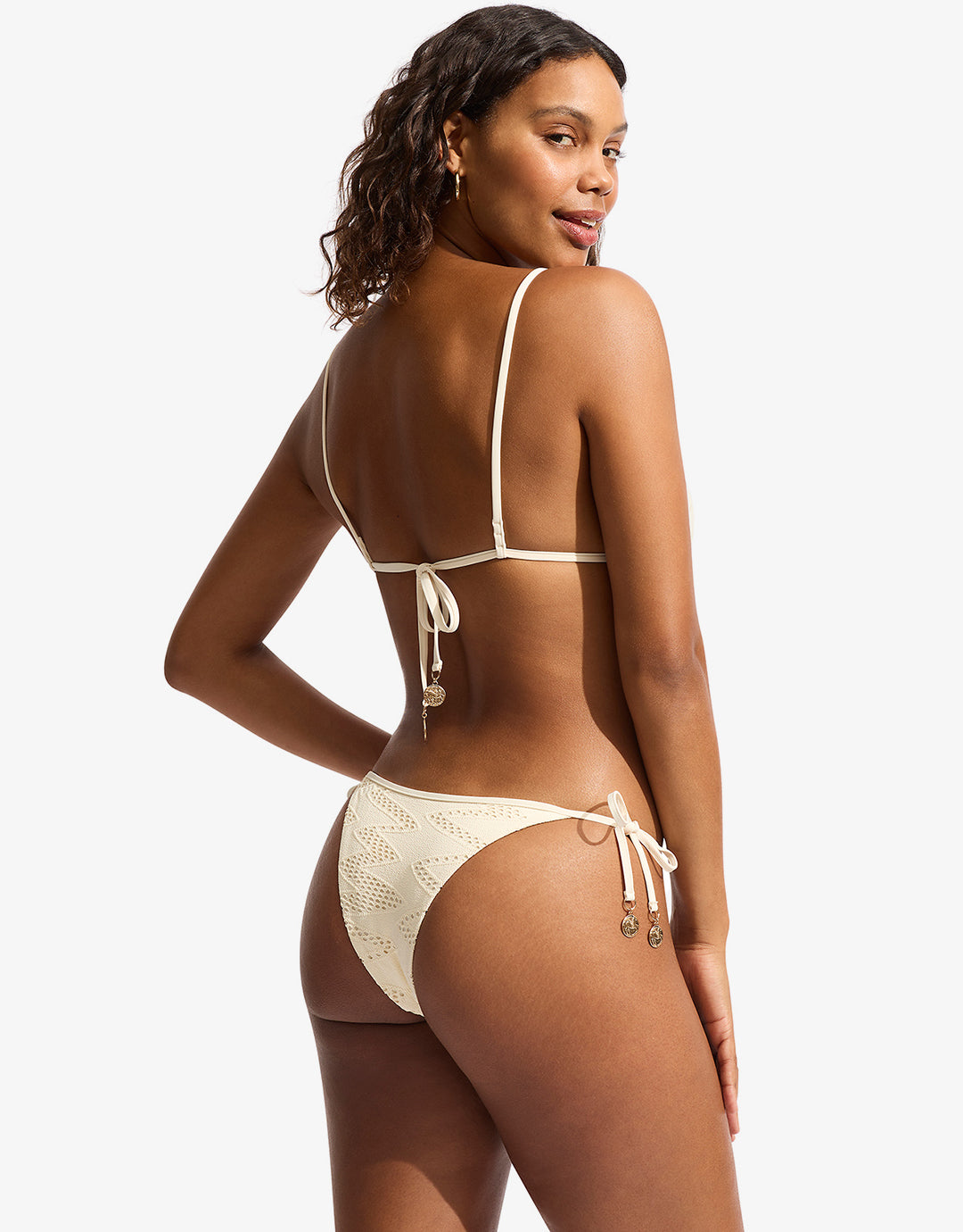 The Chiara Rio Tie Side bikini pant from Seafolly is a lovely cream coloured crochet bikini pant with minimal coverage and tied side finished with metallic detailing.