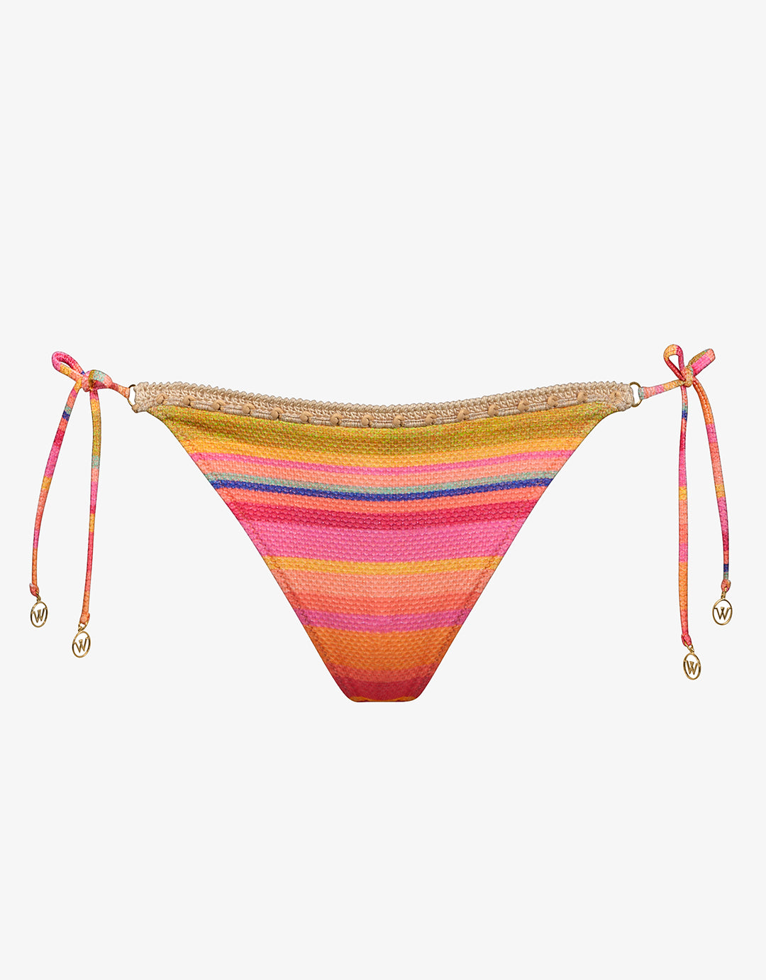 The Dopamine Stripe Tie Side bikini pant from Watercult is a gorgeous bright stripe design with pale gold coloured embroidery and beading at the waist. This bikini pant has minimal coverage with gathers at the back and narrow spaghetti ties at the sides.