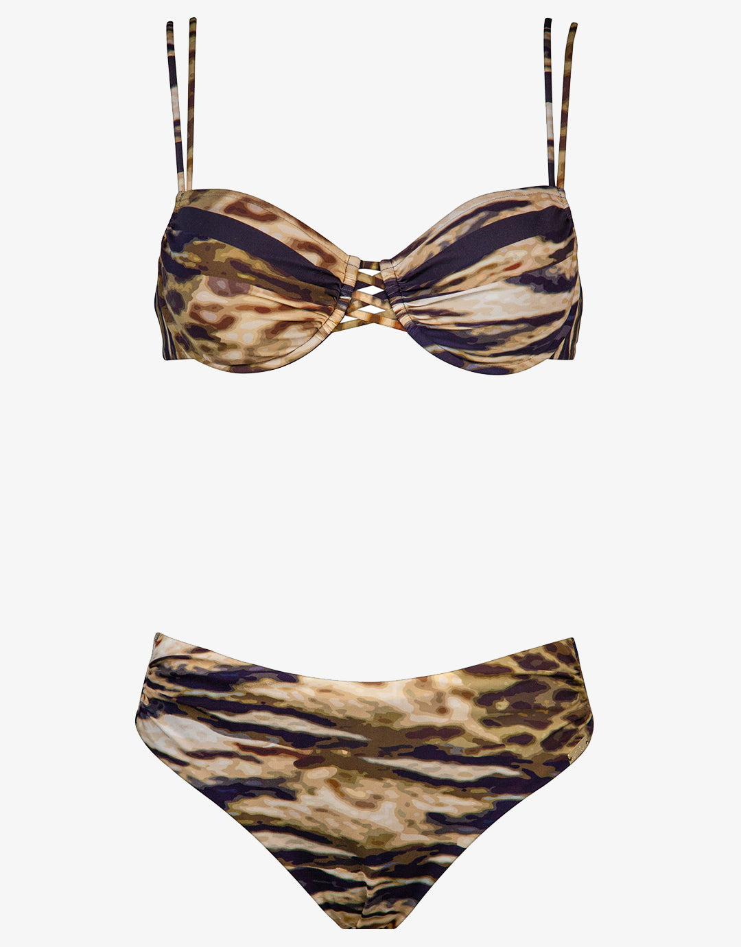 The Edge Underwired bikini from Maryan Mehlhorn is a great animal print bikini with underwired top with criss cross detail at the centre and adjustable double spaghetti straps. The bikini pant is a classic full coverage pant with a flat-frontend gathered at the side seams.