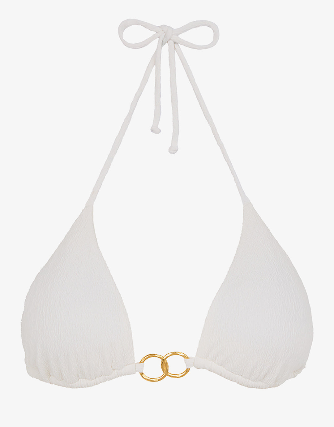 The Firenze Jolie Tri bikini top from ViX in a crisp white, textured fabric is a triangle halter style with ties at the neck and back and removable padded cups. With gold plated rings between the cups.
