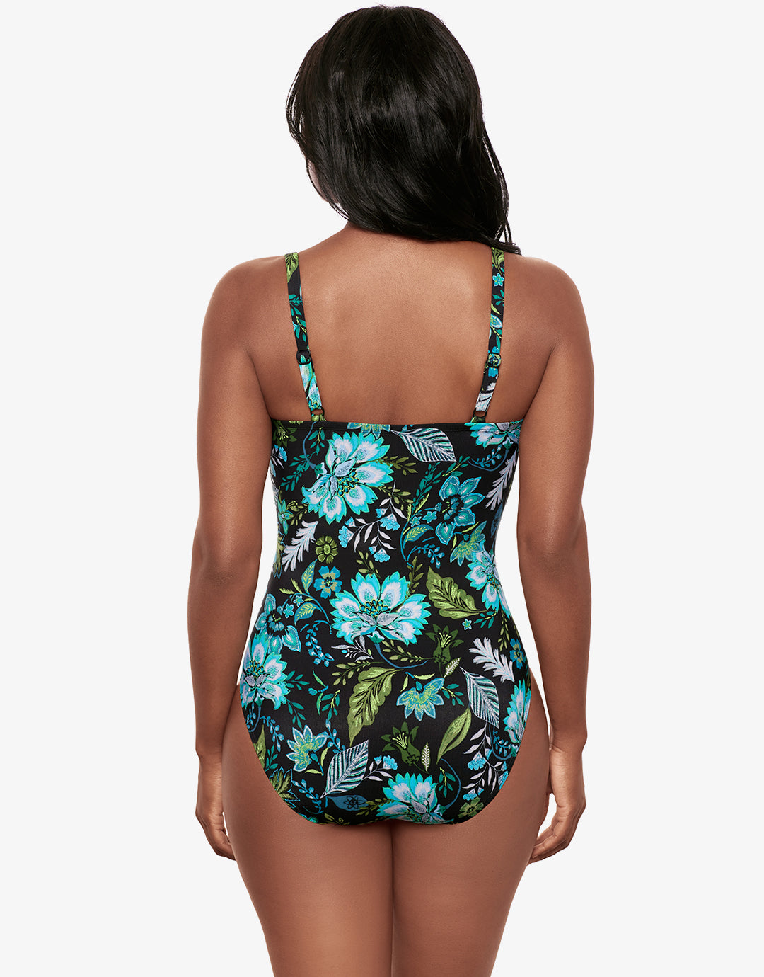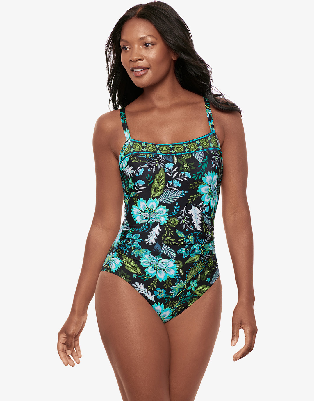 The Florica Kara swimsuit from Miraclesuit in a lovely turquoise and green floral print on a black base features a flattering square neckline, a built in underwire support and adjustable, thin straps. Subtle shirring defines the waist and Signature Miratex fabric provides tummy control.