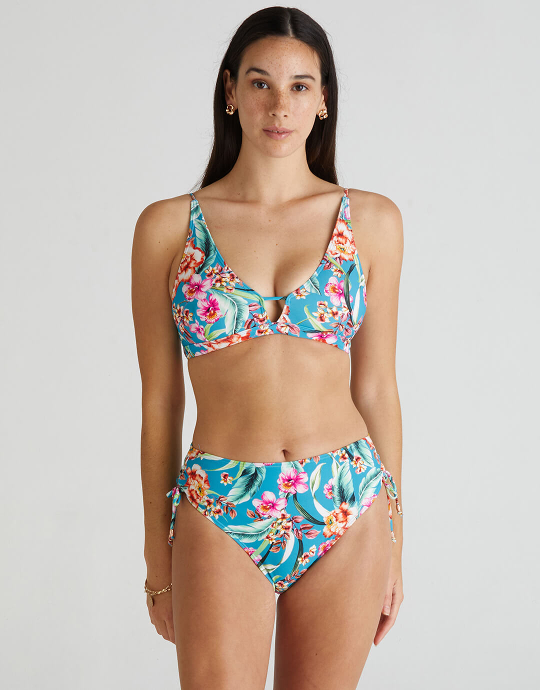 The Melody Charlotte High Waisted bikini pant from Heaven Australia is a lovely blue floral print in medium-full coverage style. With ruching and ties at the sides.