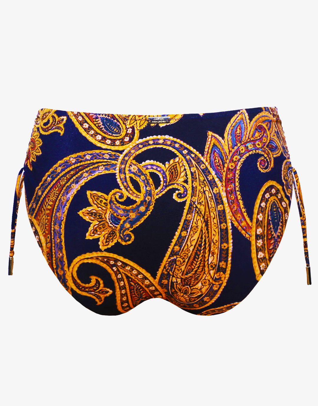 The Memory Adjustable bikini pant from Maryan Mehlhorn in navy and warm sunset shades has good rear coverage and ties to gather at the side to adjust the leg height.