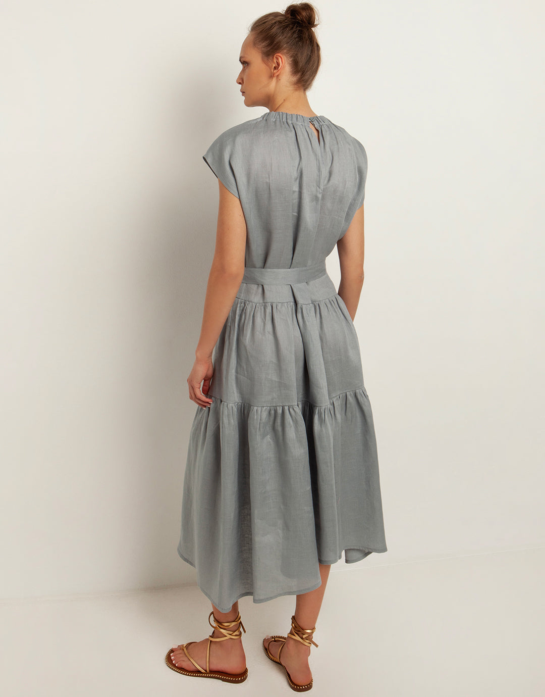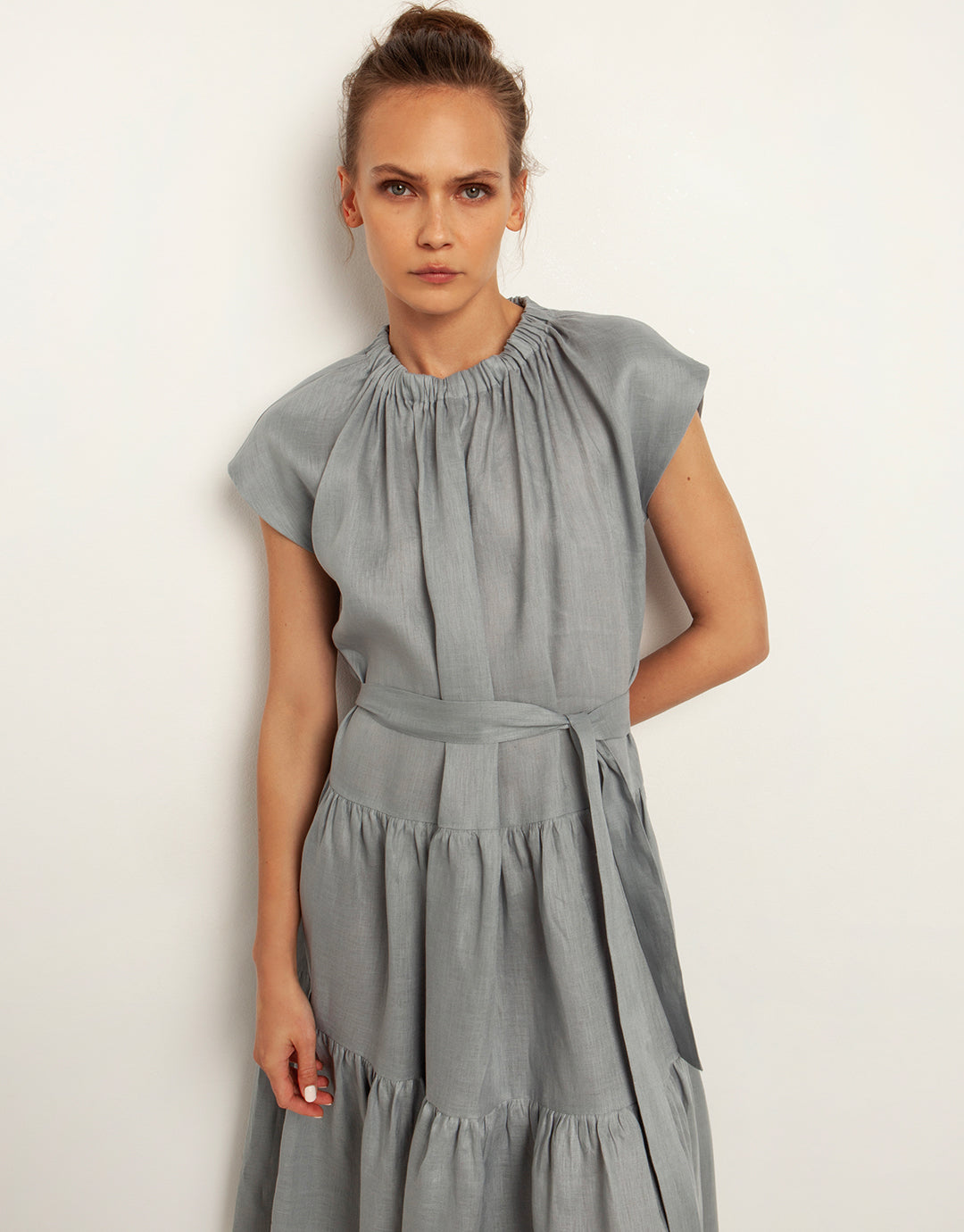 The Minimal Midi dress from Greek Archaic Kori offers understated elegance in a rich, opaque grey linen with a midi length silhouette. A gathered round neckline leading to pleats over the bust creates a flattering drape. A dropped waist flows into a tiered skirt and an optional tie belt provides versatility, allowing you to cinch in the waist as desired.