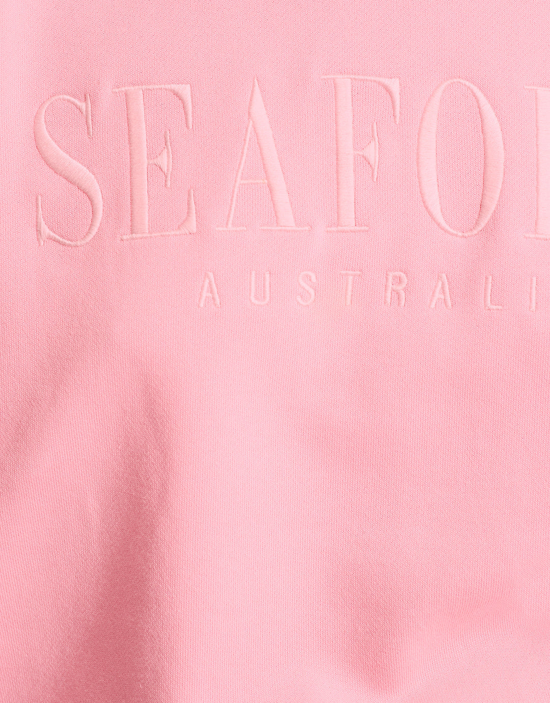 The Original Crew Sweatshirt from Seafolly is a lovely pink top with large embroidered Seafolly logo at the front. Made from soft cotton with ribbed cuffs, hem and neckline.