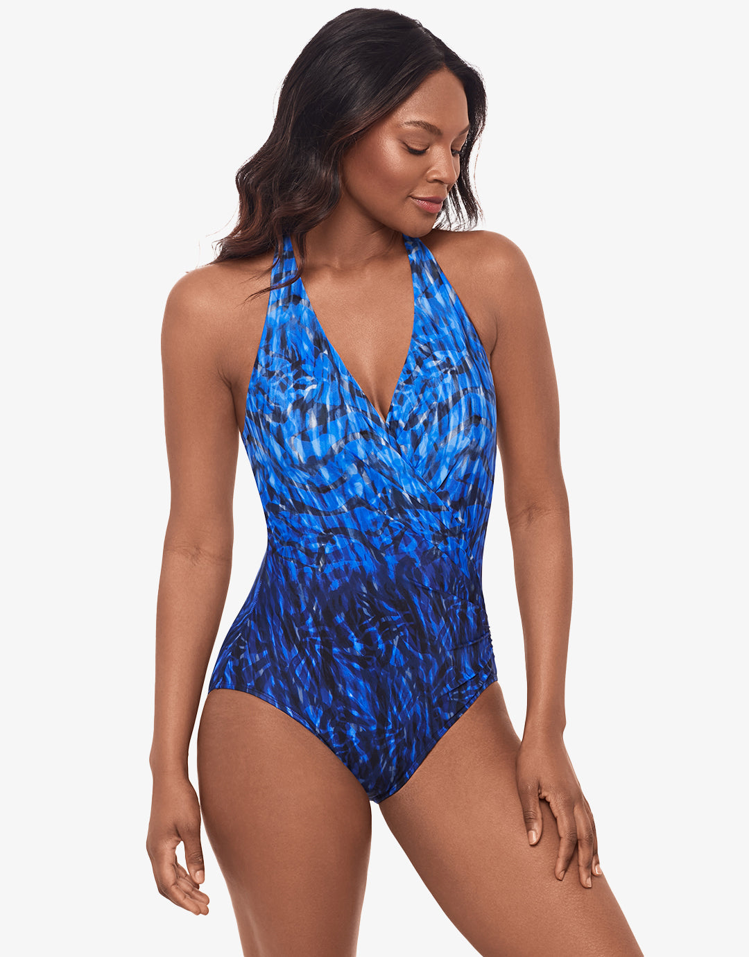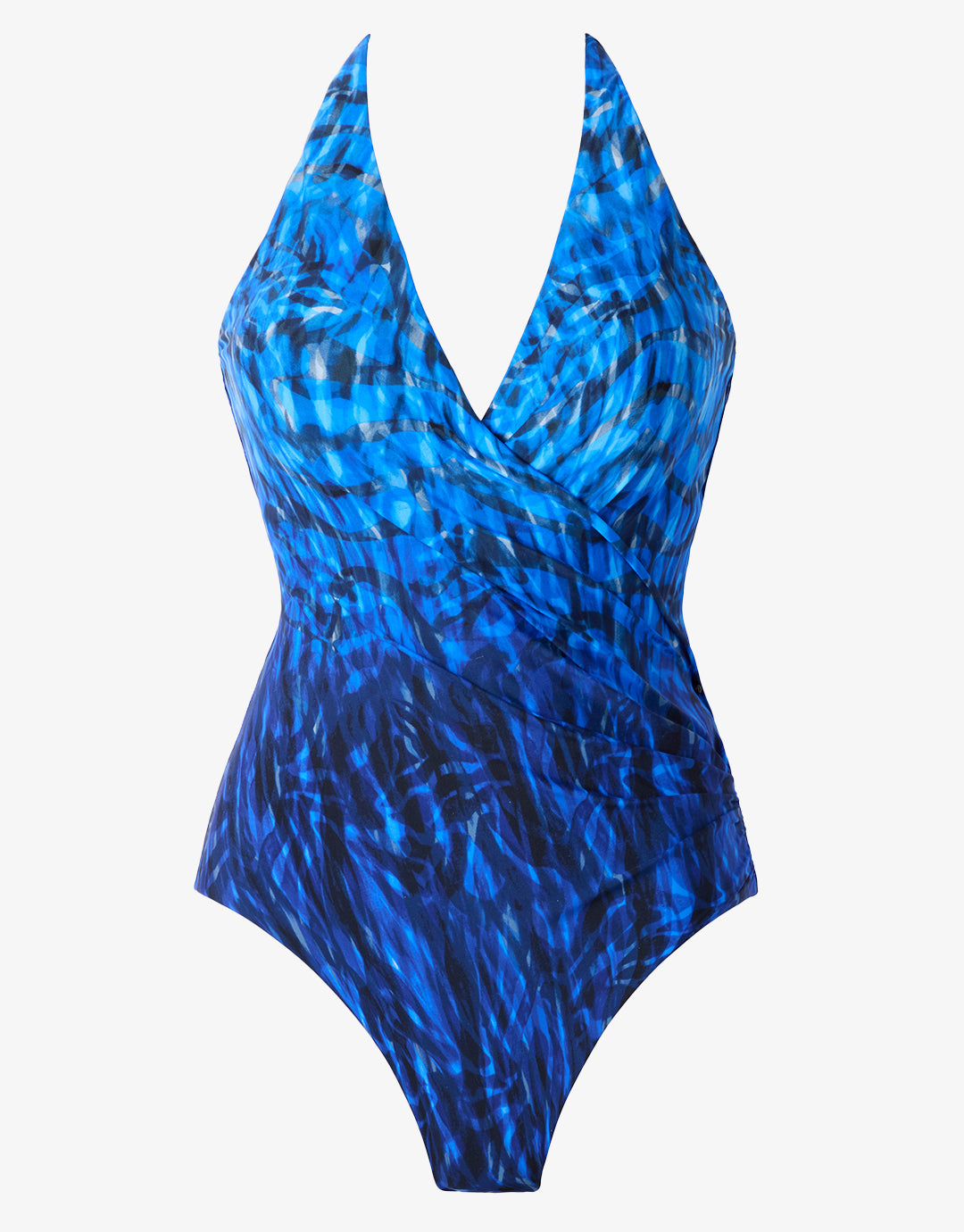 The Paka Mayan Wrapsody swimsuit from Miraclesuit is a gorgeous halter, plunging V neck style with a wrap of cleverly draped fabric to conceal a tummy. This bold blue ombre printed one piece has soft moulded cups, while the halter look at the front is finished with a clip at the back of the neck and adjustable straps giving comfort and a great fit.