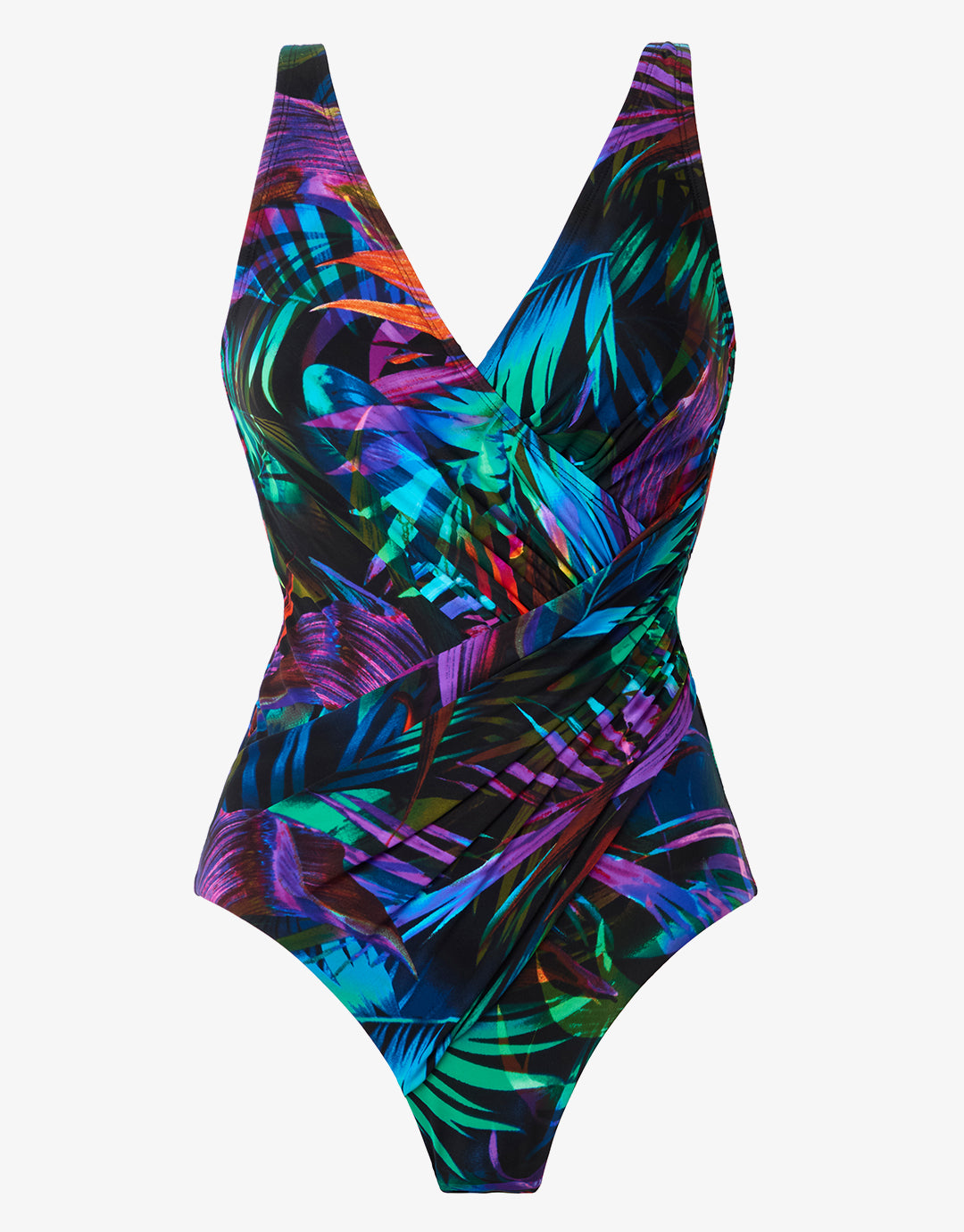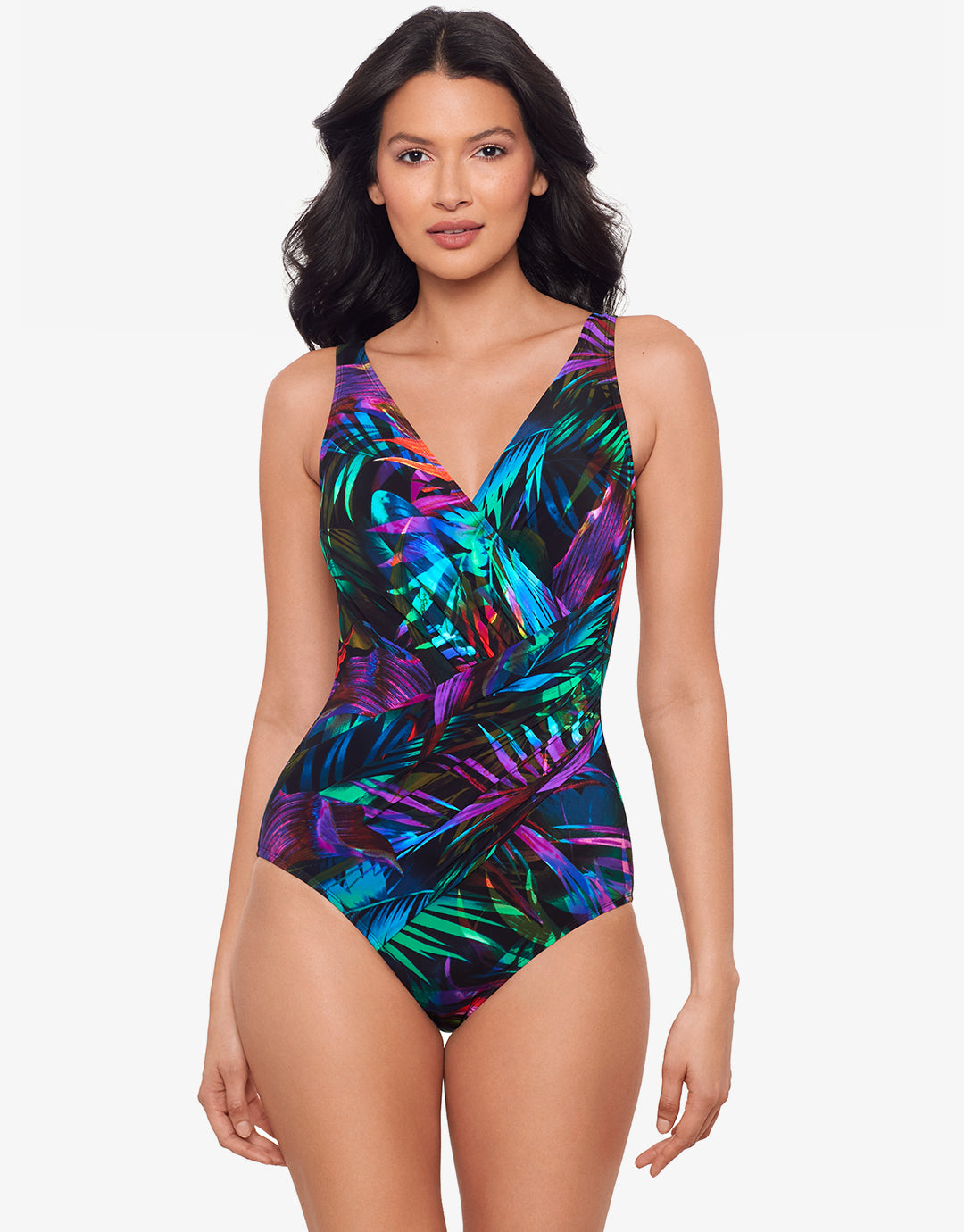 The Palma Paradiso Oceanus swimsuit from Miraclesuit in this bold mix of green and purple tropical print is a wonderfully flattering ladies wrap front swimsuit with soft cups, crossover panels and ruching on the tummy for a greater waist-minimizing effect. With adjustable straps for optimum fit.