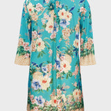 The Pineapple Sea Beach tunic from Lidea is a beautiful turquoise based print featuring placed florals and bordered hems. Made from slightly stretchy fabric in mini length with a V neck.