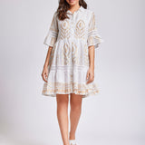 The Rachel Shirt dress from Iconique oozes opulence in pure white, printed with a light gold boho pattern. This A-line shirt dress features flare sleeves, a traditional collar and button-through front for an easy and elegant summer look.