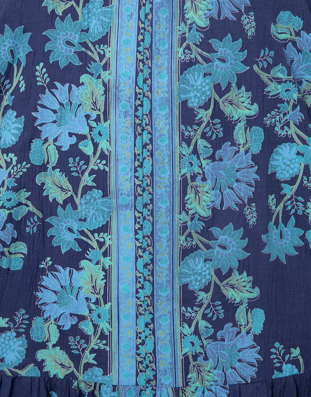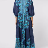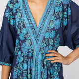 The Rose Border Print V-Neck Maxi dress from Juliet Dunn is a gorgeous kaftan style dress in deep Indigo blue with paler blue and green flowers and a border print to the neckline and hems. With loose elbow length sleeves, a deep V neck line and a tiered loose-fitting skirt.