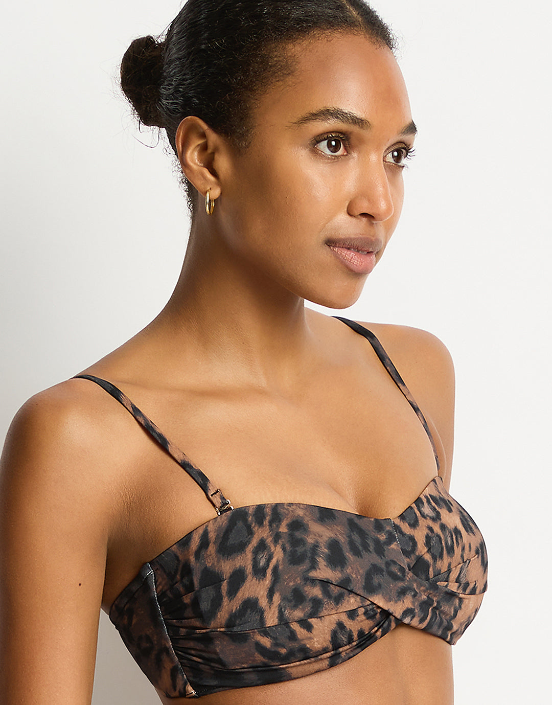 The Savanna Twist Bandeau bikini top from Sea Level in a sophisticated, rich chocolate cocoa and black animal print is a strapless bandeau style with a twist across the cups for an elevated look. Featuring padded cups and side boning for great shape whilst gripper tape prevents slips and optional adjustable straps offers extra support if needed.