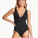 The Scallop Longline Tri swimsuit from Sea Level Australia is part of a collection of swimwear using Sea Levels Eco recycled base which has a sleek and soft hand feel and is designed for the ultimate comfort and support. This beautiful style has a plunging V neckline with scallop edging, removable soft cups, adjustable straps and power mesh in the front and back for a great supportive fit.