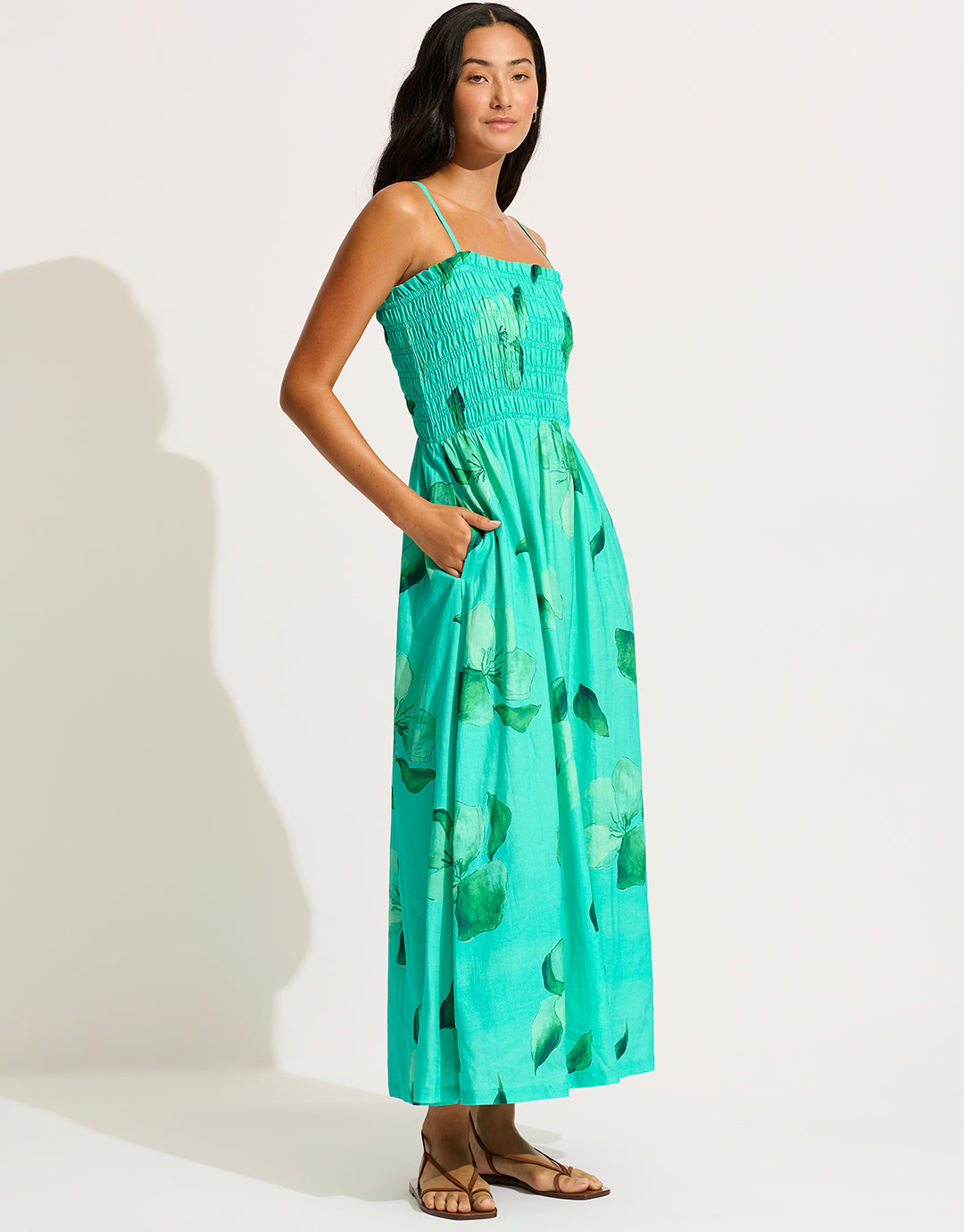 The gorgeous Secret Garden Shirred Maxi dress from Seafolly is an ankle length style with a shirred bodice and full skirt. The bodice is lined and includes narrow adjustable straps and the skirt has side seam pockets.