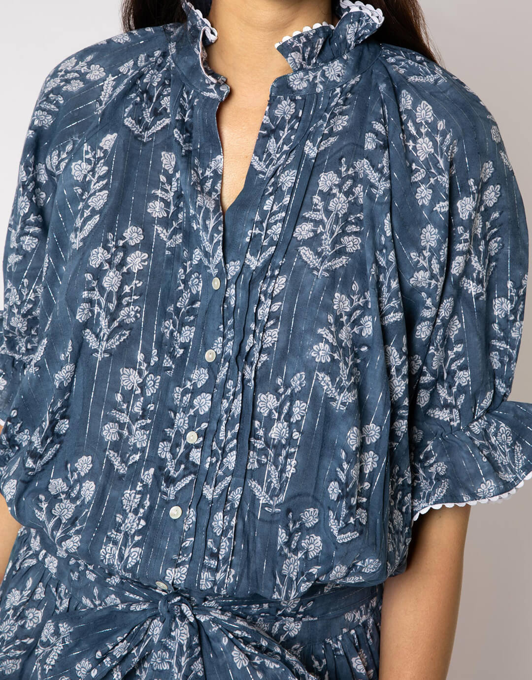 The Small Flower Block Print Blouson Dress in Midnight blue from Juliet Dunn is a mini length dress with a buttoned front, elbow-length gathered sleeves and the neck is finished with a fluted collar. This dress can be worn loose and low at the hips or higher at the waist and cinched with the adjustable waist ties. Hand printed with white flowers and delicate silver thread stripes in the fabric to catch the light.