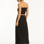 The Sunset Beach Skirt from Sea Level is a maxi-length skirt with a decorative shirred waist, flattering drop waist, short side slits and drawstring tie.