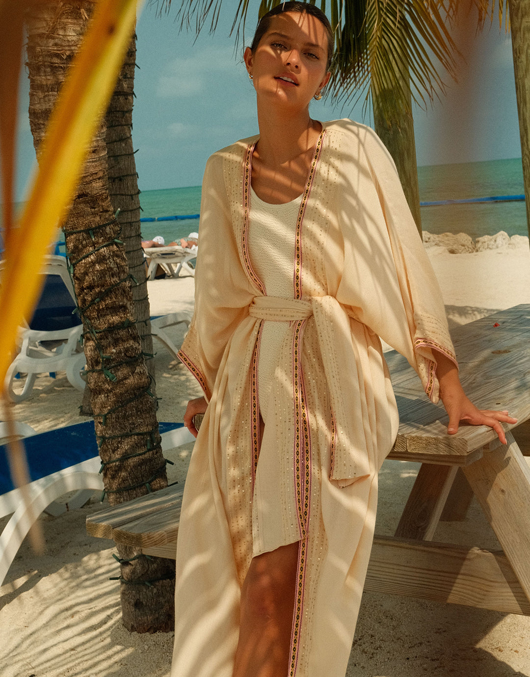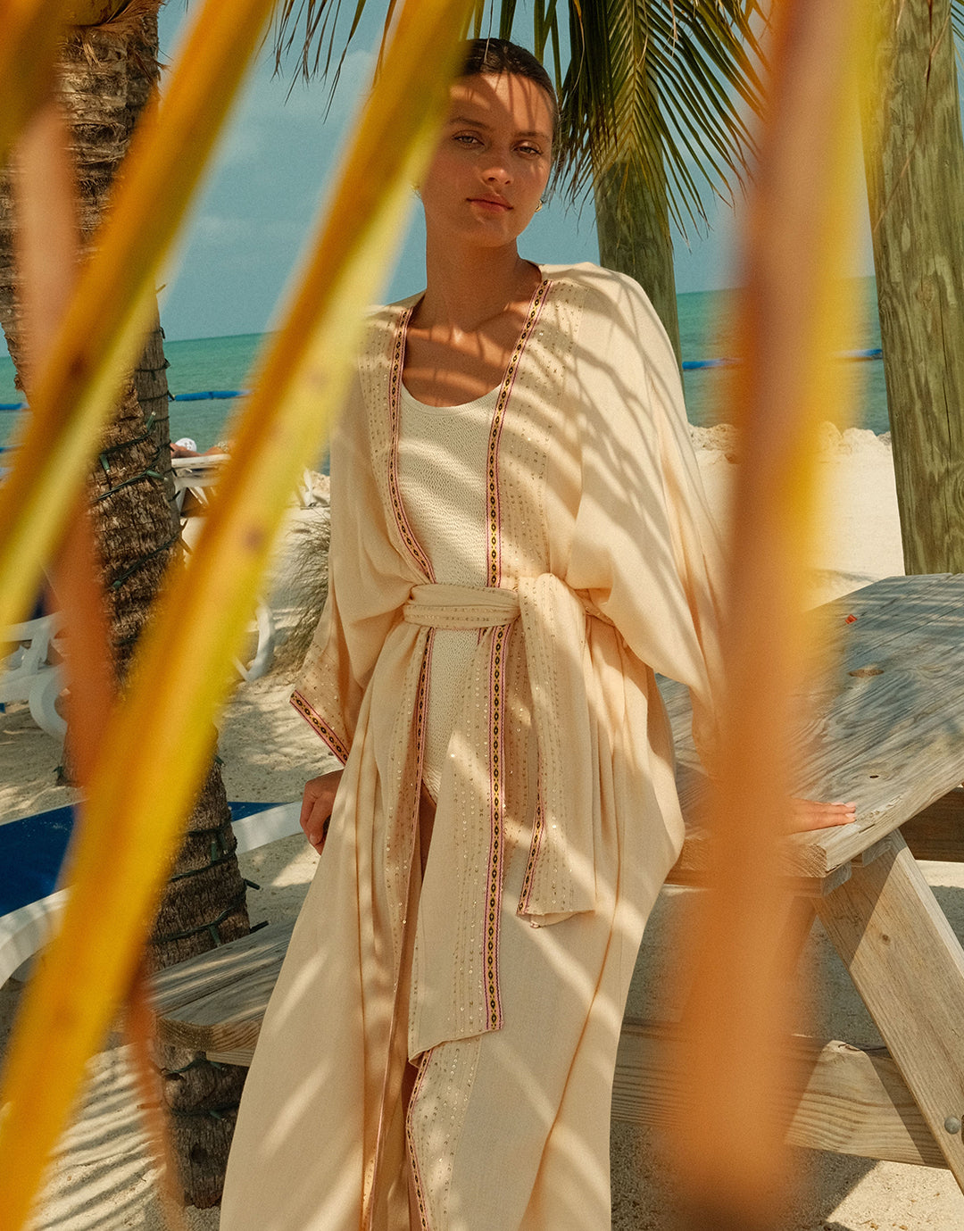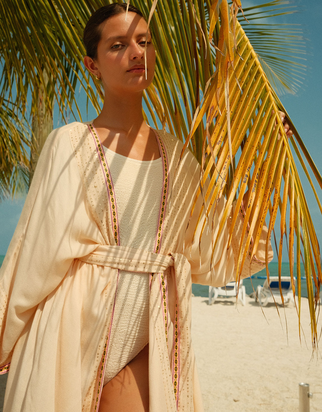 The Vanessa Sequin kimono from Pitusa is a beautiful pale melon coloured style with sequin and Inca weave detailing at the edges and hems. In loose fitting style with wide kimono style sleeves and a sash tie.